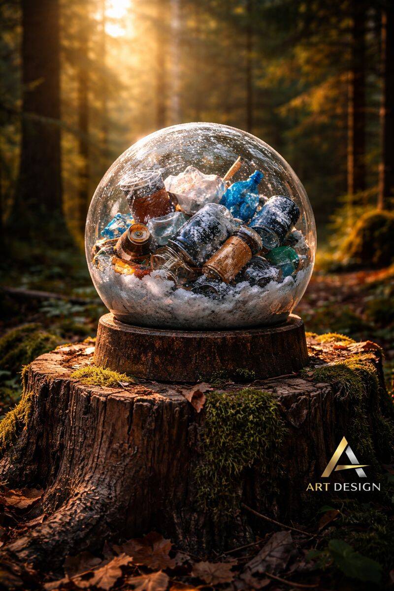 Auf einem moosbedeckten Baumstumpf mitten im Wald steht eine gläserne Schneekugel – eigentlich ein Symbol für Kindheit, Winterzauber und heile Welt. Doch ihr Inneres erzählt eine andere Geschichte: Statt Schnee und Miniaturlandschaft ist sie gefüllt mit Abfall – zerdrückte Dosen, Plastikflaschen, Scherben, Reste menschlichen Konsums, eingefroren in schmutzigem Eis.